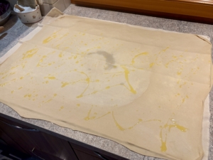 Zubereitung: Alle Zutaten zu einem glatten, geschmeidigen Teig verkneten. Eine Teigkugel formen und glatt schleifen. Anschließend den Teig rundum mit etwas Öl bestreichen, in eine Schüssel legen, mit Frischhaltefolie abdecken und mindestens 30 Minuten ruhen lassen. Ein Strudeltuch oder ein großes, sauberes Geschirrtuch ausbreiten und leicht mit Mehl bestäuben. Den Teig darauf geben, flachdrücken und ebenfalls leicht mit Mehl bestäuben. Anschließend den Teig etwa 1 cm dick rund ausrollen und mit den Handrücken behutsam auf die Größe des Tuchs auseinanderziehen.