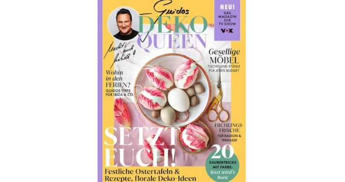 Außerdem wird in dem tollen Lifestyle-Magazin verraten, was man mit Farbe Tolles anstellen kann. Die Redaktion schaut inspirierende Wohnungen an und gestaltet die Küche um – und natürlich wird Ostern gefeiert! Mit allem, was dazugehört: mit liebevollen Deko- und Geschenkideen und einem köstlichen wie unkomplizierten Menü für Familie und Freunde. Dazu reicht man ausgewählte Tableware, Besteck-Sets, Karaffen und gestaltet drei geschmackvolle Essplätze für jedes Budget. Und wenn beim Tafeln und Feiern mal was daneben geht, zeigt der großer Fleckenguide, wie man Rotwein, Schokolade & Co. elegant beseitigt. Doch das ist noch lange nicht alles! Die Top-Adressen für Papeterie& Co. wecken jetzt die Lust aufs Kreativwerden. Und es geht endlich wieder nach draußen: Zum Start der Outdoor-Saison zeigt das Magazin, wie man Balkon und Terrasse hübsch macht. Außerdem geht es ab auf die Insel – auf Guidos spanische Lieblingsinseln Ibiza und Mallorca. Und natürlich wird auch wieder hinter die Kulissen der TV-Show „Guidos Deko Queen“ gemacht.