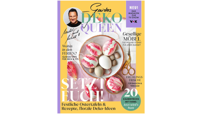 Außerdem wird in dem tollen Lifestyle-Magazin verraten, was man mit Farbe Tolles anstellen kann. Die Redaktion schaut inspirierende Wohnungen an und gestaltet die Küche um – und natürlich wird Ostern gefeiert! Mit allem, was dazugehört: mit liebevollen Deko- und Geschenkideen und einem köstlichen wie unkomplizierten Menü für Familie und Freunde. Dazu reicht man ausgewählte Tableware, Besteck-Sets, Karaffen und gestaltet drei geschmackvolle Essplätze für jedes Budget. Und wenn beim Tafeln und Feiern mal was daneben geht, zeigt der großer Fleckenguide, wie man Rotwein, Schokolade & Co. elegant beseitigt. Doch das ist noch lange nicht alles! Die Top-Adressen für Papeterie& Co. wecken jetzt die Lust aufs Kreativwerden. Und es geht endlich wieder nach draußen: Zum Start der Outdoor-Saison zeigt das Magazin, wie man Balkon und Terrasse hübsch macht. Außerdem geht es ab auf die Insel – auf Guidos spanische Lieblingsinseln Ibiza und Mallorca. Und natürlich wird auch wieder hinter die Kulissen der TV-Show „Guidos Deko Queen“ gemacht.